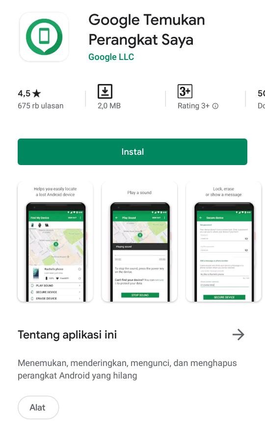 Cara pertama yang harus kalian lakukan adalah cari aplikasi di Google Playstore yang bernama “Temukan Perangkat Saya”, setelah itu download aplikasinya. Jika proses download sudah selesai, silakan kalian buka aplikasi tersebut.