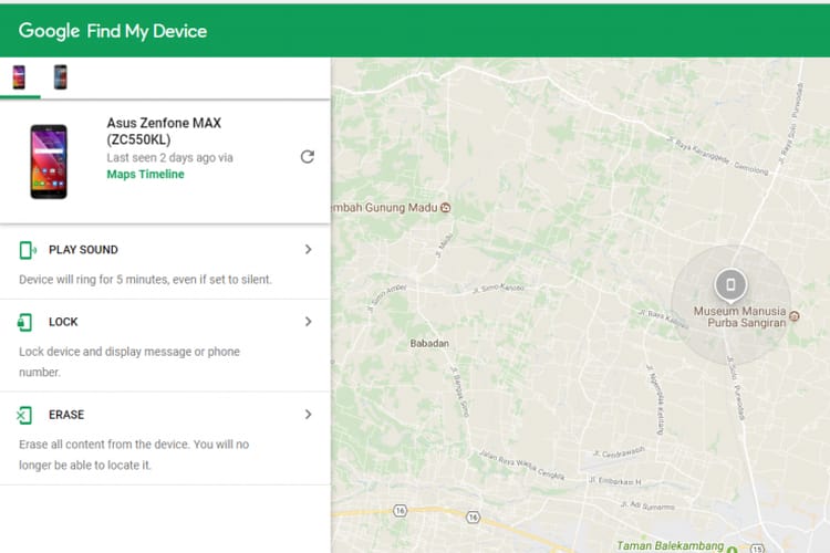 Pilihan ketiga adalah “Erase Device” atau “Hapus Perangkat”, jangan pernah menekan opsi ini jika kalian tidak mau semua data yang ada di handphone kalian hilang. Namun opsi ini sangat membantu jika orang yang menemukan handphone kalian itu tidak mau mengembalikan hape tersebut. Karena dengan sekejap, data penting atau pribadi yang ada di hape kalian bisa dihapus. Lalu fitur lain yang tak kalah canggih adalah fitur untuk melacak keberadaan hape yang hilang dengan menggunakan maps. Nah itu tadi beberapa langkah awal untuk mengatasi handphone kalian yang hilang. Ingat jangan panik, lakukan langkah demi langkah, niscaya handphone kalian akan kembali.